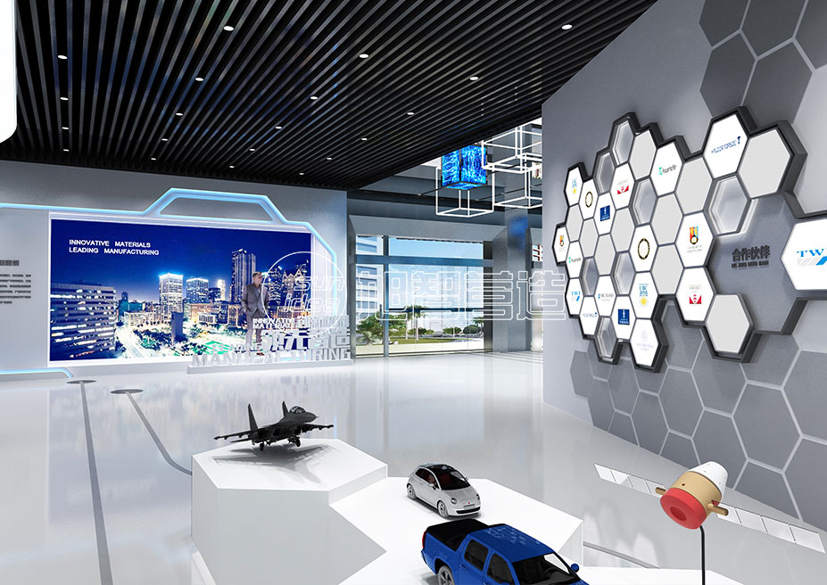展廳規(guī)劃在相城高鐵新城管委會(huì)、省產(chǎn)業(yè)技術(shù)研究院指導(dǎo)下,立足習(xí)近平總書記“新材料產(chǎn)業(yè)是戰(zhàn)略性、基礎(chǔ)性產(chǎn)業(yè),也是高技術(shù)競(jìng)爭(zhēng)的關(guān)鍵領(lǐng)域,我們要奮起直追、迎頭趕上”的指導(dǎo)方針,將新時(shí)代下新材料肩負(fù)的重大歷史使命作為出發(fā)點(diǎn),集科普、宣傳、招商功能于一體。整體設(shè)計(jì)以藍(lán)白為主色調(diào),打造創(chuàng)新、高科技感,以簡(jiǎn)潔精煉的設(shè)計(jì)語(yǔ)言,將原子結(jié)構(gòu)排序與變化進(jìn)行藝術(shù)結(jié)合,打造寓意先進(jìn)材料無(wú)限創(chuàng)新與變化組合的設(shè)計(jì)語(yǔ)言“原立方”,并貫穿始終,讓參觀者切身感受新材料的魔力。